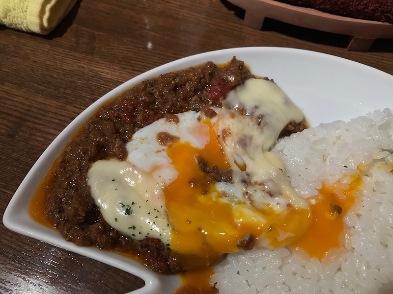 A broken yolk and melted cheese over keema curry and rice - all you ever need out of life right here. - image © Florentyna Leow