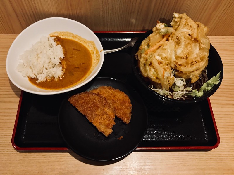 Soba with jumbo mixed vegetable tempura (kakiage) and half-size curry rice. - image © Florentyna Leow