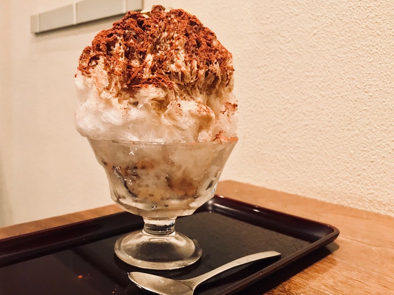 A thick dusting of cocoa powder on top gives way to layers of ice - fine, fluffy, feathery shards of it saturated with coffee syrup and condensed milk. The ice has been gently shaped into its dome, but not packed so tightly that the fluffiness is lost. Chopped nuts, seeds, and a core of smooth white bean paste inside make this a far more substantial and complex confection than your average shave ice. 'Not too sweet’ is, in many parts of East Asia, high praise for a dessert. It certainly is, in my book, and Naniwaya’s coffee-milk kakigōri earns full marks on that front.