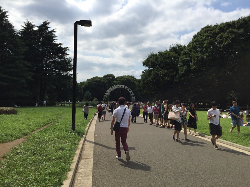 The park is split into two parts, which I'll refer to as the park side and the festival side. The difference between them, as you may have guessed, is that the park side is all grass and trees and the festival side is all concrete. The park side is where you'll enter if you arrive at Harajuku Station or Meiji-jingumae Station, and the main entrance is where I encountered the rockabilly dancers. If you can pull yourself away, continue on into the park, perhaps stopping at the first of several refreshment shacks on your left just inside the entrance to grab a frozen treat, a soft drink, a beer, or some outdoor sporting equipment.