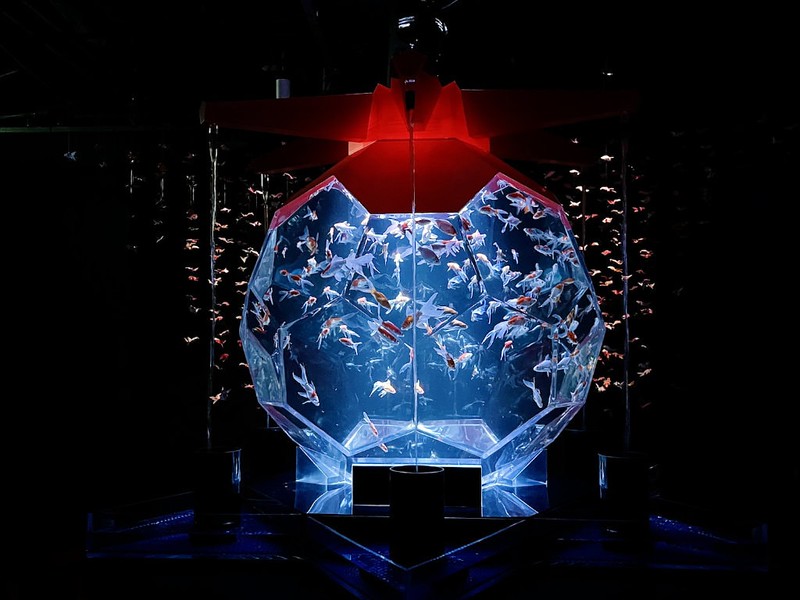 “Chochinrium” is a fun artwork that takes Japanese festival lanterns as its inspiration. A wide corridor has spherical glass tanks under each lantern eave; the tanks act like magnifying glasses, making the goldfish seem to expand, shrink, stretch, and warp as it swims around inside. It’s both funny and surreally beautiful, to see their features take on such bizarre proportions.